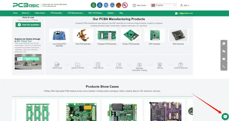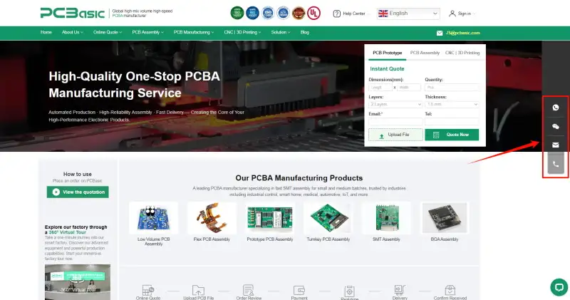 On the right side of each page of the PCBasic website, there is a fixed floating contact bar (including WhatsApp, WeChat, email, and phone number). Clicking on any of them will directly connect you with us.