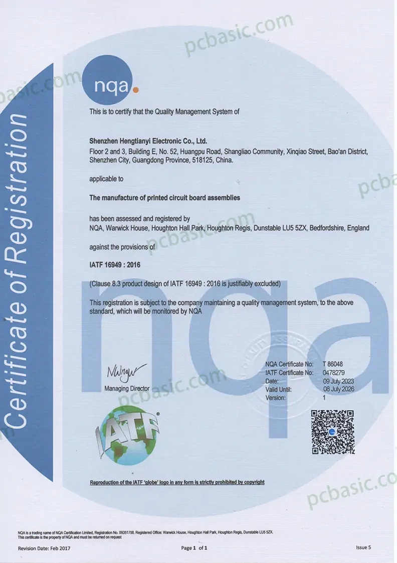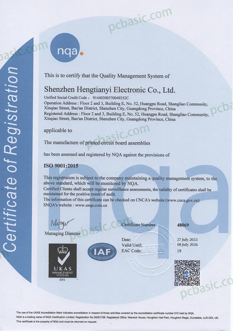 ISO 9001: 2015 is a global quality management standard that focuses on customer needs, process control, and continual improvement. At PCBasic, it ensures you receive consistent, traceable quality from material sourcing to final delivery.