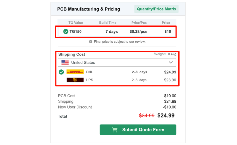 After confirming the price and lead time, click “Submit Quote Form” to add the