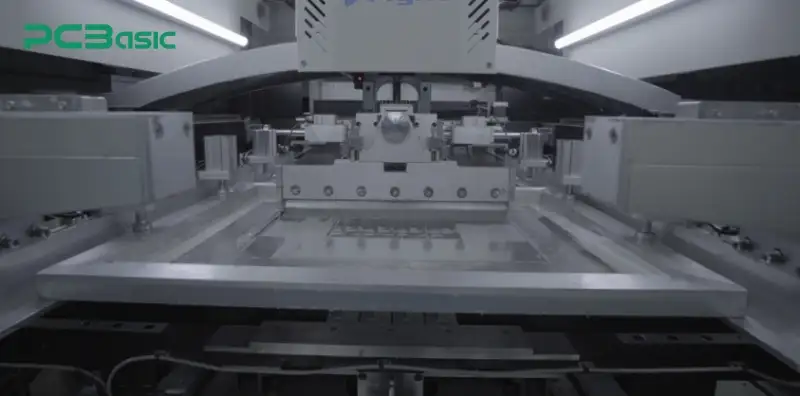 In the SMT assembly process, the first piece of equipment to be set up is the fully automatic solder paste printer. PCBasic uses an automatic printing device equipped with a 3D SPI system, which can monitor the thickness, volume and position deviation of the solder paste in real time. The main function of this equipment is to evenly and accurately apply the solder paste onto the corresponding pads of the PCB through a stainless steel stencil and a precise scraper system. This step is crucial in the entire SMT process, as it directly affects the strength and conductivity of the subsequent solder joints.